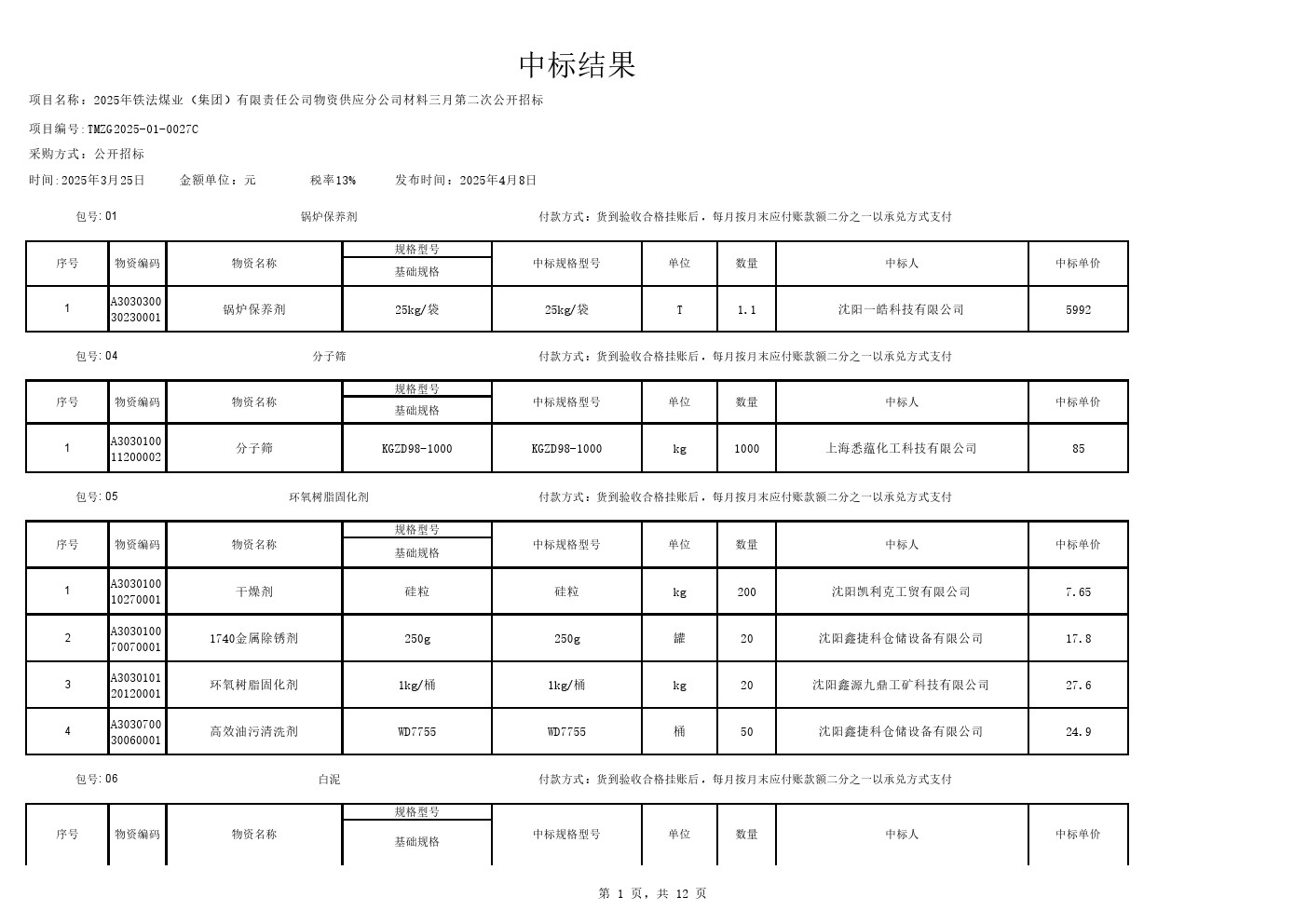 2025年3月25日材料公开招标中标结果公告(0027C)