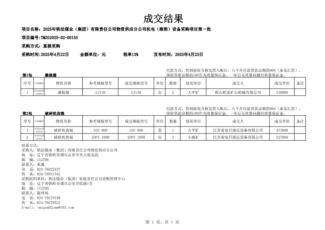 2025年4月22日机电(维简)设备成交结果公告(0015S)