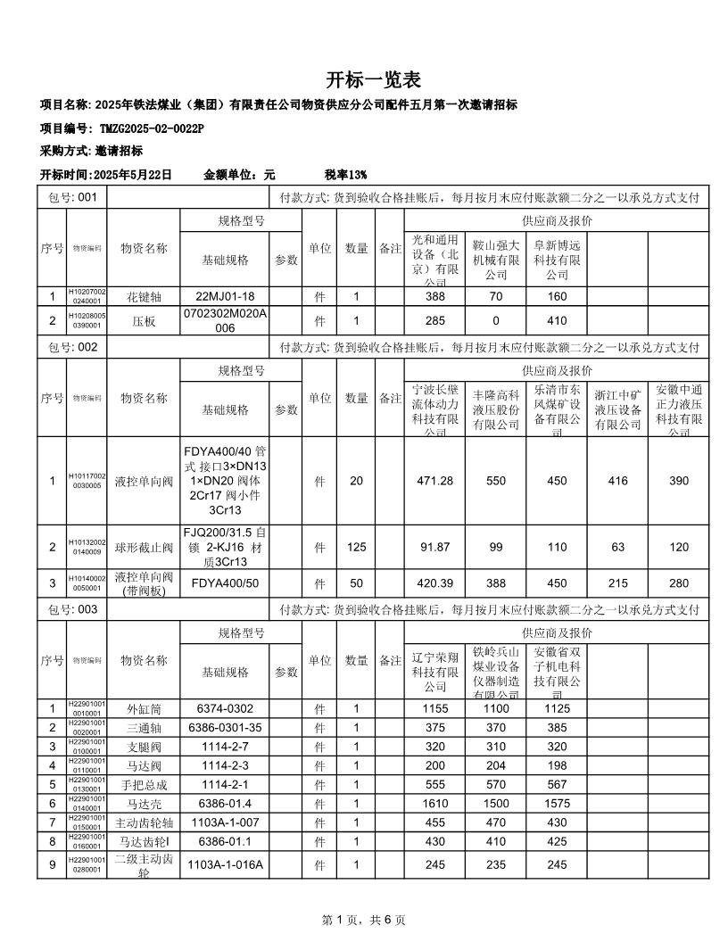 2025年5月22日配件邀请招标开标一览表(0022P)