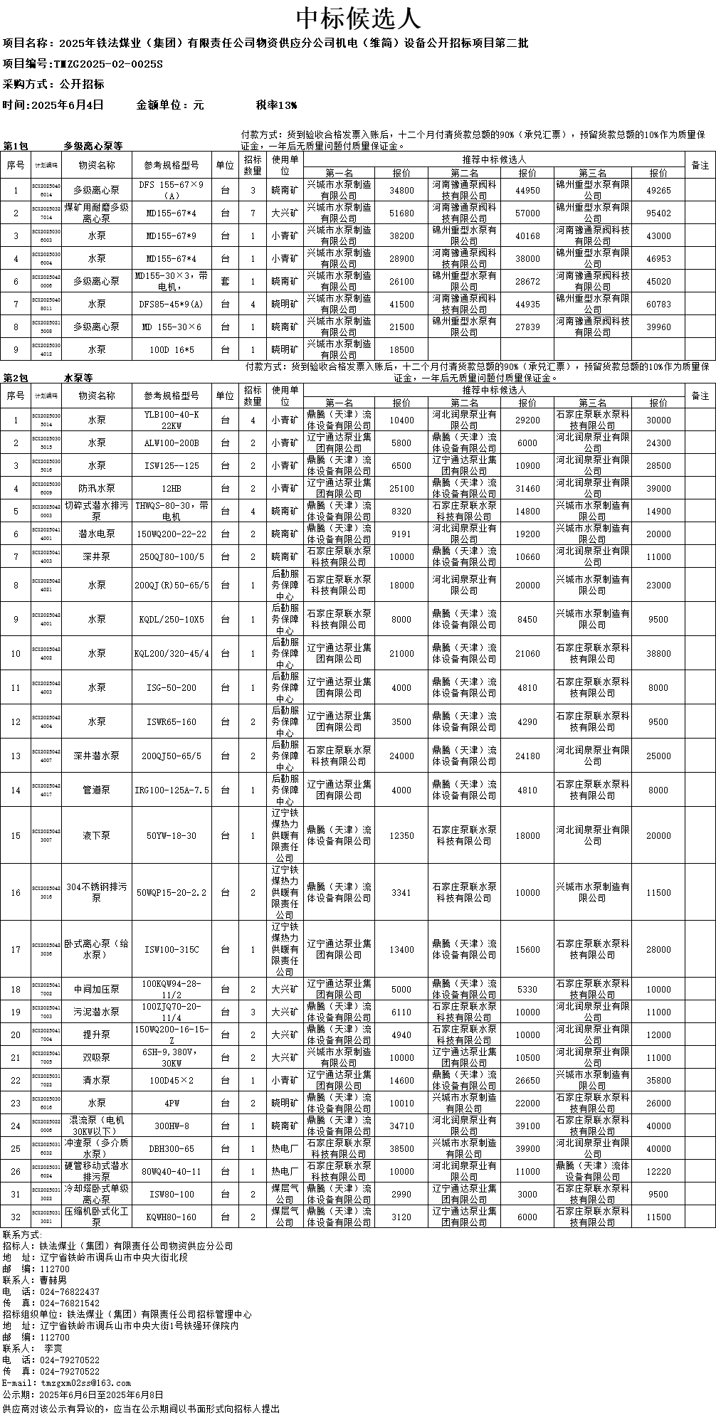 2025年6月4日机电设备(维简)公开招标项目第二批中标候选人公示(0025S)