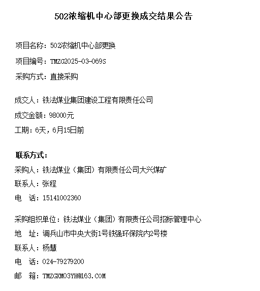 大兴煤矿502浓缩机中心部更换成交结果公告