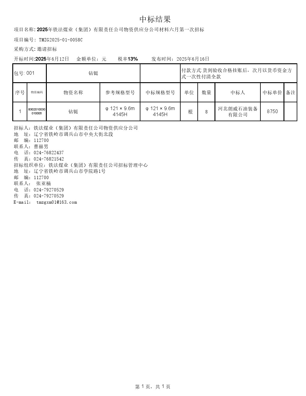 2025年6月12日材料邀请招标中标结果公示(0058C)