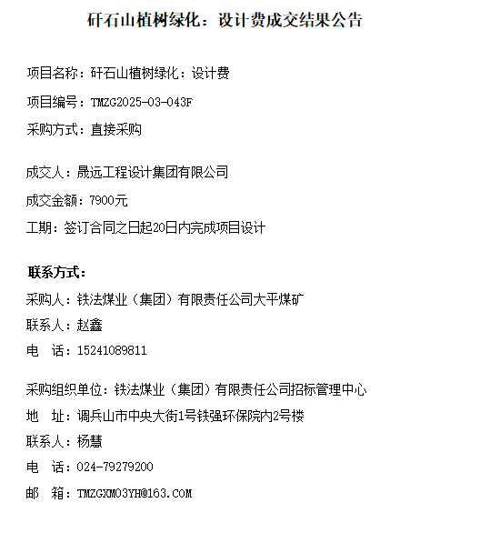 大平煤矿矸石山植树绿化:设计费成交结果公告